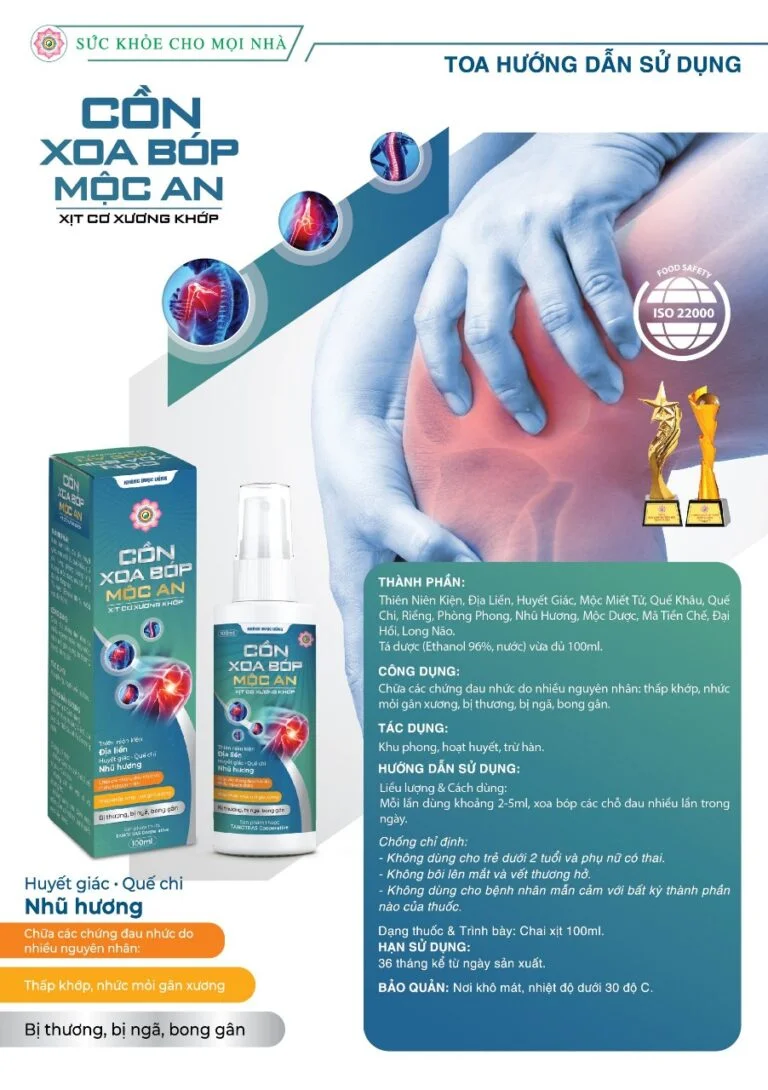 Cồn xoa bóp Mộc An – Giải pháp thảo dược giảm đau hiệu quả Cồn xoa bóp Mộc An là sản phẩm hỗ trợ sức khỏe từ thảo dược thiên nhiên, được nhiều người tin dùng trong việc giảm đau nhức xương khớp, tê bì chân tay, co cơ và cải thiện lưu thông khí...